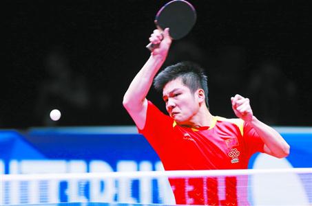 图为:樊振东在比赛中回球。他以3比0战胜德国队选手菲卢斯