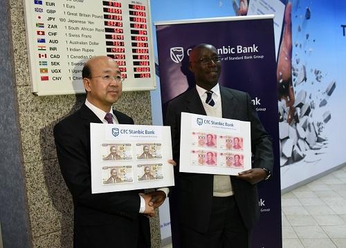 2016年7月13日,在肯尼亚首都内罗毕的标准银行肯尼亚分行总部,当时的中国驻肯尼亚大使刘显法(左)和标准银行肯尼亚分行行长菲利普·奥德拉(右)出席人民币现钞自由兑换业务发起仪式。 新华社记者 李百顺 摄