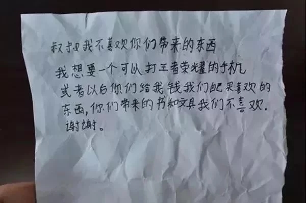 “叔叔我不喜欢你们带来的东西,我想要一个可以打王者荣耀的手机或者以后你们给我钱,我们自己买喜欢的东西,你们带来的书和文具,我们不喜欢,谢谢”。