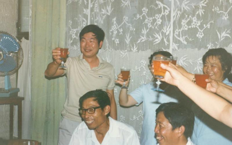 蒲慕明(左一)在南开大学庆祝中国第一台自制单通道电记录仪成功。中科院神经所提供