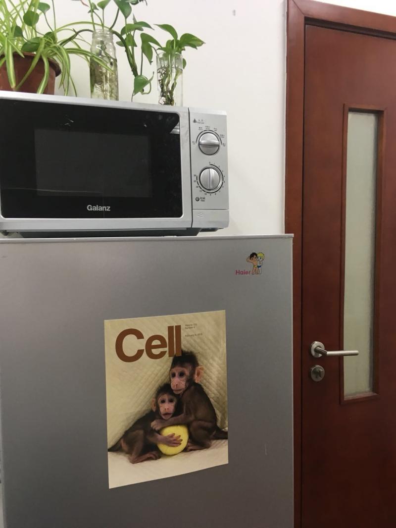 蒲慕明办公室的冰箱上,张贴着刊载了世界上第一个体细胞克隆猴论文的《细胞》封面。