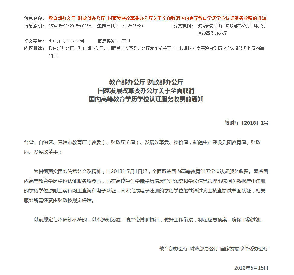 三部门印发通知:7月1日起全面取消高等教育学历学位认证费