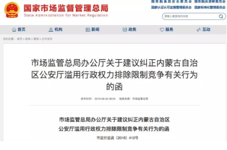 用网友的话来说,“函的内容很猛”,不仅直指一省的办公厅——内蒙古自治区办公厅,而且用语毫不客气,称此函意在纠正内蒙古自治区公安厅滥用行政权力、违反反垄断法的行为。