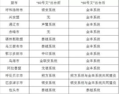 上面这张图,是“60号文”出台前后内蒙古各盟市印章系统一览表。可以很清晰地看到,“60号文”出台前,自治区各地基本都建了自己的系统,没有一家是金丰系统。而“60号文”之后,有9家都采用了金丰系统。