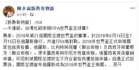 2018年俄罗斯世界杯正在如火如荼的进行,2日,陈水扁在脸书“新勇哥物语”中发表自己对世足赛的想法:希望蔡英文当局能提出申办世界杯足球赛的长远计划。最关键的是,“有助连任”。