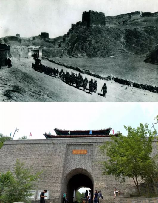 上图为日军进入古北口镇城门(资料照片);下图为2017年6月21日拍摄的古北口镇城门(新华社记者王化娟摄)。