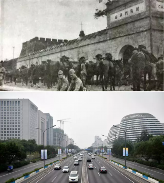 上图为1937年8月8日,日本骑兵在朝阳门车站集结(资料照片);下图为2017年7月3日拍摄的朝阳门地区(新华社记者张晨霖摄)。