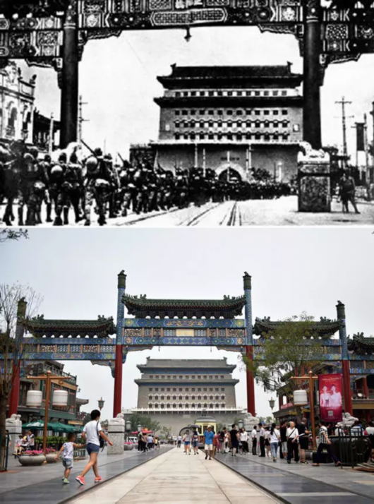 上图为1937年7月29日,日军侵入正阳门(资料照片);下图为2017年7月3日拍摄的正阳门(新华社记者张晨霖摄)。