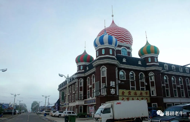 透过这些民舍间的空隙,可以望远处有不少顶着洋葱头的建筑,这让我想起昨夜到达室韦时在大巴上看到的那一片灯火,想必这一定是室韦的中心,于是就加快步伐匆匆走去。这是一个建筑群,有商店有旅馆,如内地的商业旅游街,称“俄罗斯风情街”,但实在假得很,勾不起半点兴趣,于是我往回走。