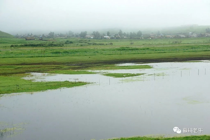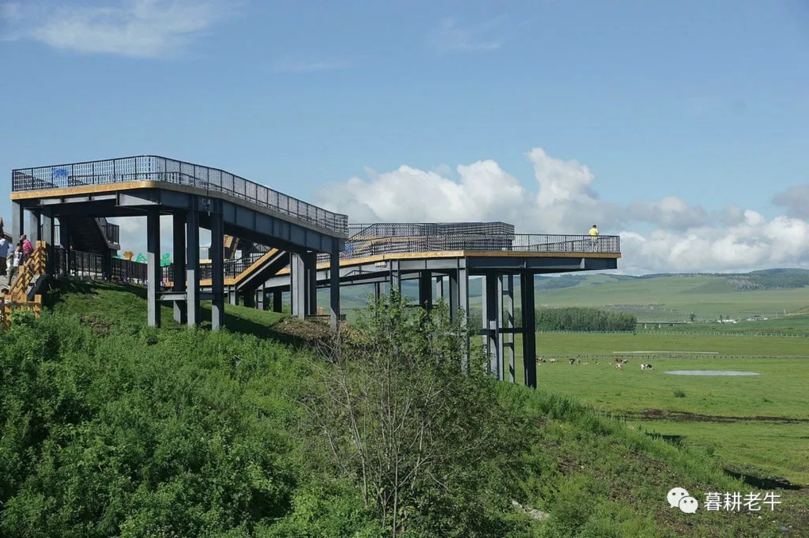 观景平台就在我刚才到达的“洋葱头”的不远处,刚才因为不屑看这假的风情街,差点就错过了。平台尚在修建中,但可以上去。都说“站得高看得远”,站在平台上,界河两岸的景色尽收眼底。室韦地处额尔古纳市西北部,与俄罗斯赤栽塔州涅区隔河相望,边境线长达136.4公里。眼下,平躺着的是一大片翠绿色的草甸与清澈的水泊组成的湿地,草甸里有闲适地吃着草儿的牛羊,有信马由缰的牧人,也有在水中的小洲上休憩的鹅鸭。对岸山坡上是俄罗斯人的村庄,大多是灰色屋顶的平房;界河额尔古纳河就在村庄前面缓缓地流淌着,平静而安详。村后是层层的烟雾,看不清究竟。曾经的剑拔弩张已经不见了,和平的气氛弥漫在河之两岸。这对于我们这些曾经经历过上世纪六十年代中苏关系紧张时期的投身到“屯垦戍边”行列的知青来说,体会尤深。在那些“备战备荒”的日子中,冒着零下三四十度的严寒操练,在野外爬冰卧雪的付出,为的不就是现在这样一个和平的环境吗?