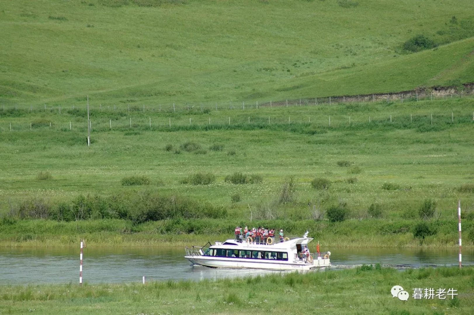 也许是为了了却许多人未能见到室韦俄罗斯风情的心愿,大巴又将我们拉到了观景平台下。室韦早上8点的阳光已经十分的强烈,额尔古纳河两岸顿时明媚了起来。进入室韦的这段额尔古纳河是在平缓的土地上前行的,没有高山,没有峻岭,更没有如刀削一般的悬崖,也没有如我们昨天的莫尔道嘎森林公园所见的遮挡视线的树木,除了俄罗斯一侧是漫坡形的山地外,有的只是一大片平缓的绿地。于是,它从容不迫地流淌着,留下了一大片葱茏的湿地、如茵的草甸,滋养着在这里的子民,让他们在它温暖的怀抱中繁衍生息。