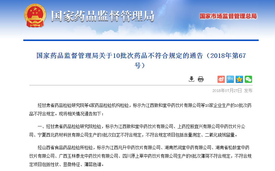7月27日,国家药监局官网发布消息,称经多家机构检验,哈药集团三精制药诺捷制药有限责任公司等10家企业生产的10批次药品不符合规定。