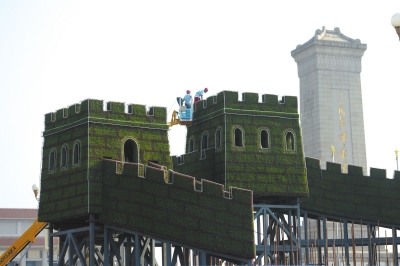 8月12日起,天安门广场上开始搭建“长城”主题花坛。京华时报记者谭青摄