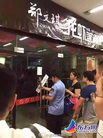 东方网记者程琦、蒋泽8月16日报道:有微博粉丝爆料称,郑文琪龙虾盖浇饭五角场店于8月16日被上海工商部门查封,具体查封原因暂时不详。而据微博和朋友圈盛传郑文琪龙虾盖浇饭使用的原料存在很大问题,很可能是死的小龙虾。