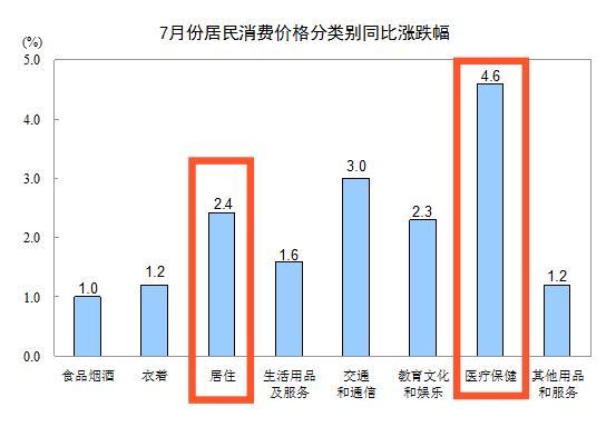 先看一组国家统计局公布的数据,今年7月份相比去年同期:蛋类价格上涨11.7%,禽肉类价格上涨6.6%,鲜菜价格上涨3.8%,医疗保健上涨4.6%、交通和通信上涨3.0%、居住价格上涨2.4%,教育文化和娱乐上涨2.3%。另一方面,从环比来看,就是与6月份相比,猪肉价格上涨2.9%。总体评价是:CPI环比由降转升,同比涨幅略有扩大。