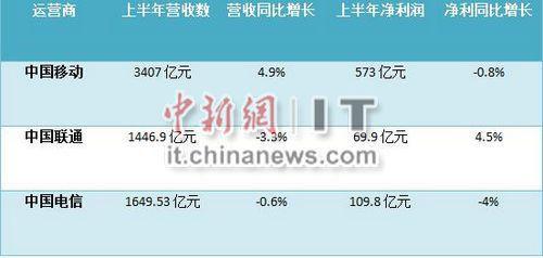 截止上周五,三大运营商今年上半年业绩均已出炉。财报显示,2015年上半年中国移动营收3407亿元,同比增长4.9%,净利润为573亿元,同比下降0.8%;中国电信收入达到1649.53亿元,股东应占利润为109.8亿元,同比下降4%;中国联通上半年收入1446.9亿元,同比下降3.3%,净利润为69.9亿元,同比上升4.5%。