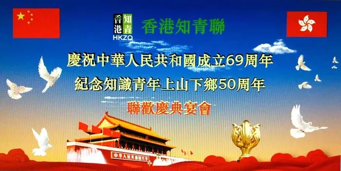 10月6日,香港知青联为庆祝中华人民共和国成立69周年、纪念知识青年上山下乡50周年联欢庆典宴会在港粤华酒店举行。香港知青联会长韩阳光,常务副会长杨安坪、张瑞境、李秉涌等共同出席并主持了联欢会。