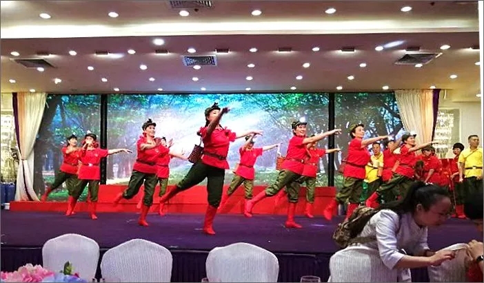 文艺演出由广州粤海农垦(兵团)知青网派出的Q群演出队的舞蹈《宝岛风华》压轴。这是一个她们近年精心排练的一个反映知识青年当年开山劈岭种橡胶,从育苗到割胶全过程的,表现知青艰苦锻炼、健康成长的舞蹈节目,自上演以来,就获得各方好评。她们的认真表演,受到了香港知青朋友的热烈欢迎。