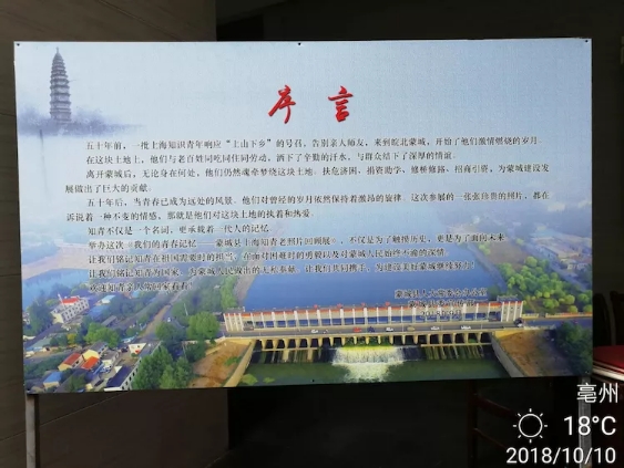 2018年10月10日,我和王礼民相约,8:50乘G230高铁,从上海虹轿站出发,11:15到蚌埠站,搭乘蒙城知青薛松鹤联系好的顺风车,不到13:00,来到蒙城博物馆《我们的青春记忆一一蒙城县上海知青老照片回顾展》。