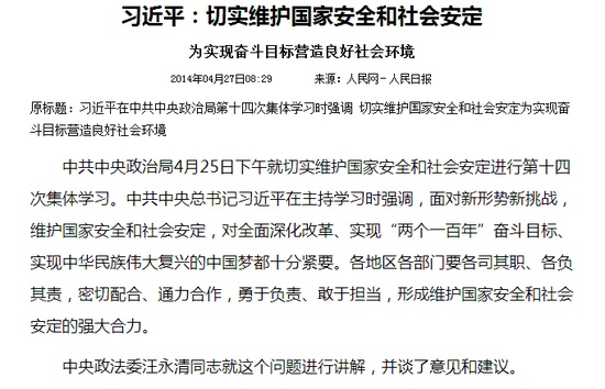 2014年4月25日,中共中央政治局集体学习,首次将主题锁定"切实维护国家安全和社会安定"。