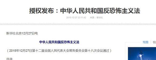 2015年12月27日,反恐怖主义法通过,该法对"恐怖主义"的定义是,"通过暴力、破坏、恐吓等手段,制造社会恐慌、危害公共安全、侵犯人身财产,或者胁迫国家机关、国际组织,以实现其政治、意识形态等目的的主张和行为。"
