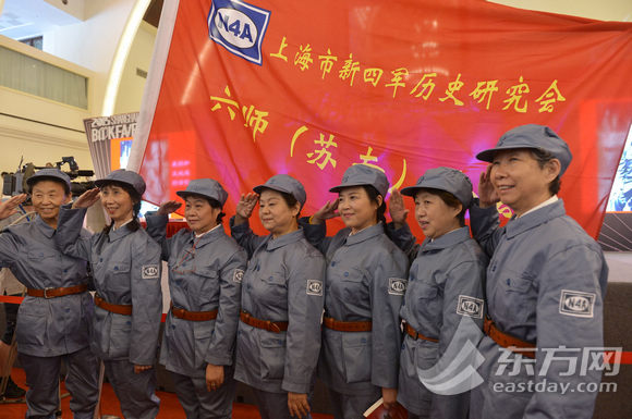 图片说明:数十位身穿新四军军装的上海市新四军历史研究会六师(苏南)研究分会的老人们来到现场为新书宣传造势。