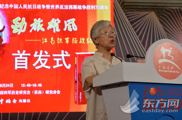 东方网记者徐程8月24日报道:今年恰逢纪念抗日战争胜利七十周年,一本记录新四军江南部队抗敌征战史实的新书《劲旅雄风——江南铁军征战纪实》今天在“上海书展”中心会场举行了新书首发仪式。新四军一师师长粟裕大将之子粟寒生、新四军六师师长谭震林之女谭泾远等众多新四军将领的后代从全国各地来到上海。还有数十位身穿新四军军装的上海市新四军历史研究会六师(苏南)研究分会的老人们来到现场为新书宣传造势。