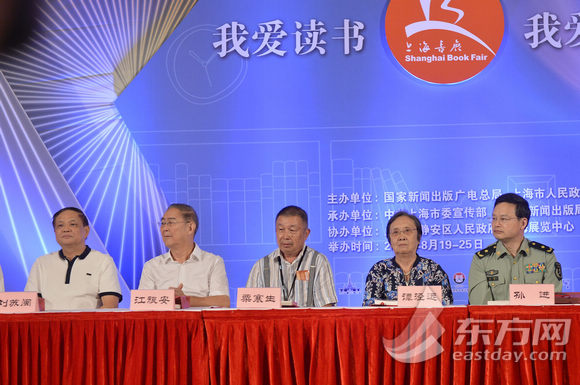 图片说明:新四军一师师长粟裕大将之子粟寒生、新四军六师师长谭震林之女谭泾远、新四军十六旅政委江渭清之子江旅安等来到上海书展参加新书首发活动。