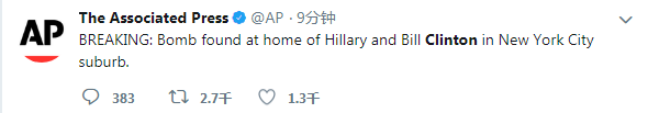 据美联社10月24日报道,克林顿夫妇在纽约郊区的住宅发现炸弹。
