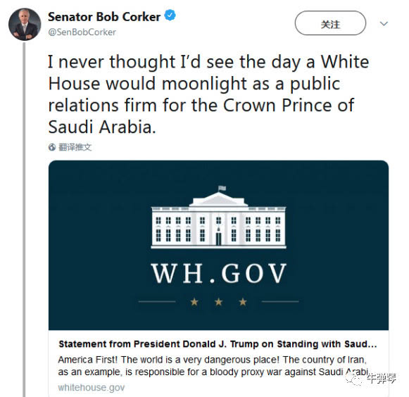 白宫这样的声明,就把和特朗普同属共和党的重量级参议员、美国外交关系委员会主席科克气得够呛。他转发了这个声明,然后加了一个评点:我从没想到,有一天白宫会兼职做了沙特王储的公关公司。