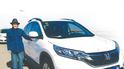 2015年10月,仲长太老人与家中第一辆汽车在黄河大桥合影。 受访者供图
