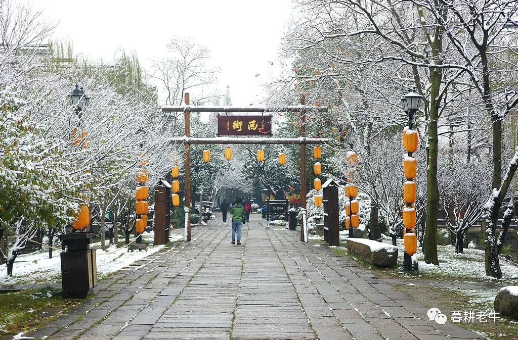 但这还不是我们要去的梅花洲。踏着石板路向前,拐个弯,不远就能看到梅花洲景区的大门了。走进大门,还是一条石板路,迎面有一木制的牌坊,上悬“西街”二字。这是梅花洲的西部景区。街两边悬挂着串串橙色的灯笼,在白雪的映衬下有着特别的感觉。道旁是招展的琼枝,笼着这油亮的道路。临冬仍然葱绿的柳树,在这银色的世界里依旧是那般的婀娜多姿。路边的徽式建筑的墙壁上爬满了青藤,掩住了它本来的面目,红红绿绿的,在雪中更显妩媚了。从街旁挂着的黄色小旗看,这西街本也是景区里的商铺,平日里一定是非常热闹的,现在全都关着门;街上无其他的游客,让这雪后的街道安静了许多,唯有我们这些返老还童的老头老太的嬉笑声。今天,我们是这雪后梅花洲的主人!