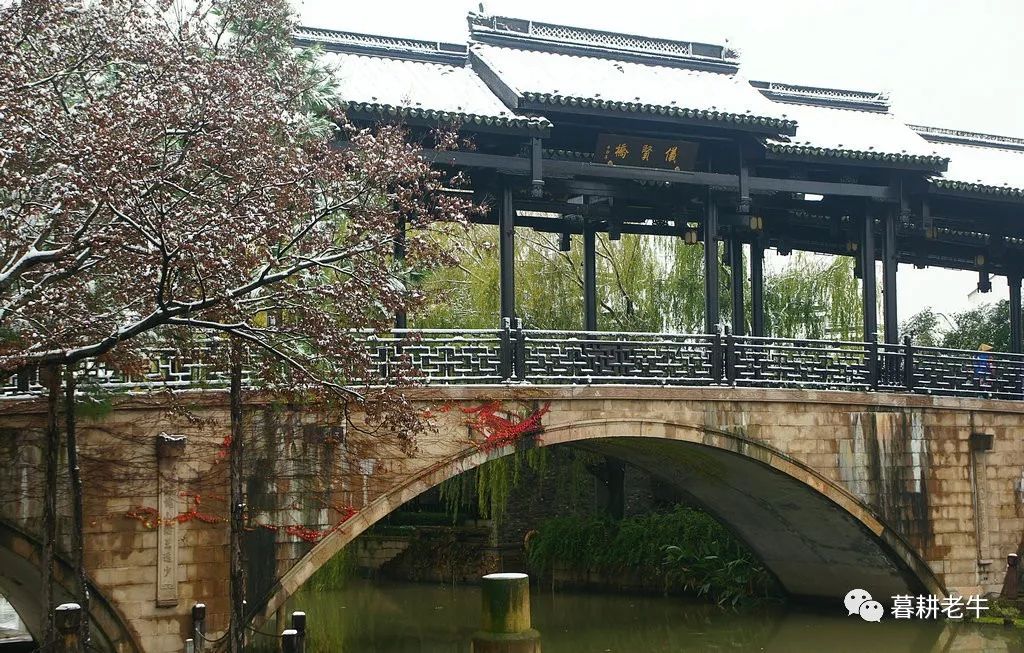 西街的尽头有一座双行的廊桥,横跨在古河道上,是为“仪贤桥”。桥以石板为基座,上覆以木制廊棚,非常雄伟。现在,它也披上了银装,连接着东西两个景区,将西侧的繁华与东面的宁静和谐地统一在了一起。景区北侧的中央有一照壁,中间高,两侧矮,“梅花洲”三个金色篆体大字就镌刻在中间的墙面上,十分的大气。桥下流淌的正是有着上千年历史的古运河支流,让梅花洲有了通江达海的气魄。