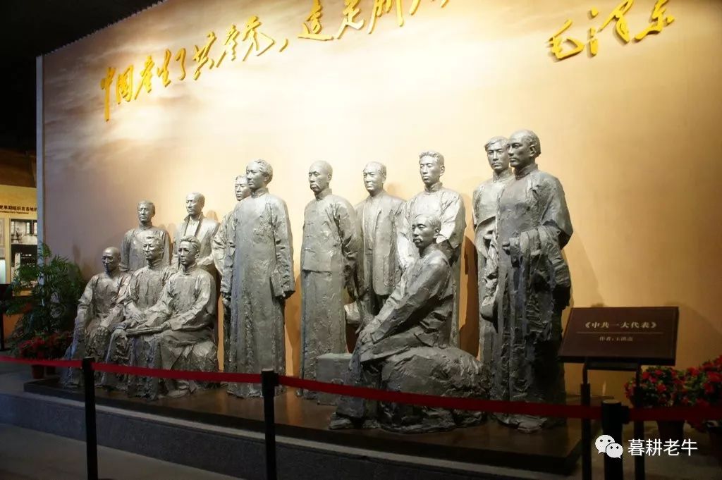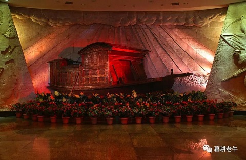 从雪花纷飞的室外进到纪念馆内的序厅,眼睛顿时亮了起来,迎面是党的一大完成最后议题的红船模型,在灯光的照射下正红光四射;红船的背景是嘉兴南湖的风景名胜,反映了中共“一大”召开的社会背景,以表现“一大”红船石破天惊般从历史画卷中奔涌而出,显示序厅“中国革命的航船从南湖扬帆起航”的中心主题。两侧是巨幅浮雕,为中国近代历史上的重大事件,寓意着“历史选择了马克思主义,人民选择了共产党”。抬头仰望,一枚巨型党徽投射穹顶上,熠熠生辉,周围围着一圈白色的灯,象征着中国共产党“指引中国革命和建设道路,照耀中华民族伟大复兴的光辉历程”,为民众在迷雾中找出一条民族复兴的光明大道。