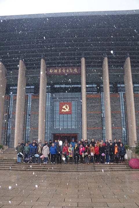不知不觉中,我们结束了这次参观,无意中发现外面的雪已经停歇,大雪为纪念馆四周的松柏水杉披上了白色的外衣,银白与苍翠交融,洁白和褚红相染,勾画出一幅的图画。出得门来,纪念馆分明了,石碑上“不忘初心,牢记使命”的大字正闪着金色的光芒,脑海中再现着“开天辟地大事变”的一幕幕场景……