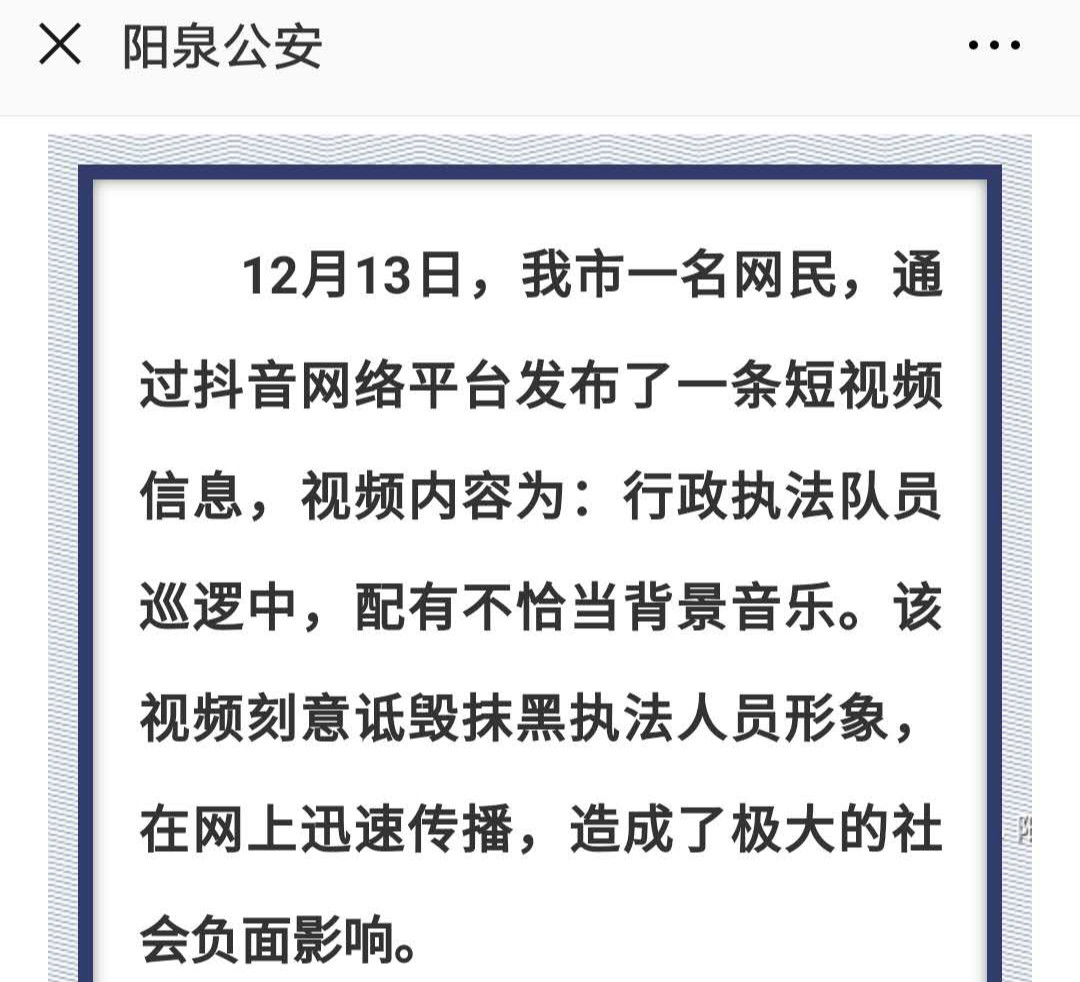 根据通报内容,12月13日,阳泉市一网民,通过抖音网络平台发布一条短视频信息,视频内容为:行政执法队员巡逻中,配有不恰当背景音乐,在网上迅速传播。