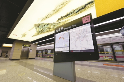 本次即将通车试运营的13号线二期(世博大道站——华夏中路站)和三期(华夏中路站——张江路站),全长16公里。13号线全线建设秉承“人文、科技、融合、创新”的理念,大量运用新技术、新工艺、新材料,克服了诸多建设难点,将高科技、人文情感融入地铁中。图为长清路站极具传统文化气息的水墨画装饰。本报见习记者邢千里摄