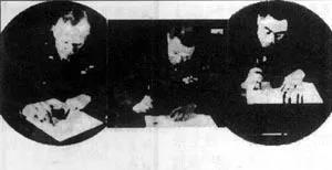 张治中(中)与周恩来(右)、马歇尔(左)签字。
