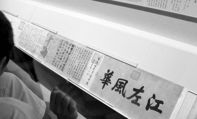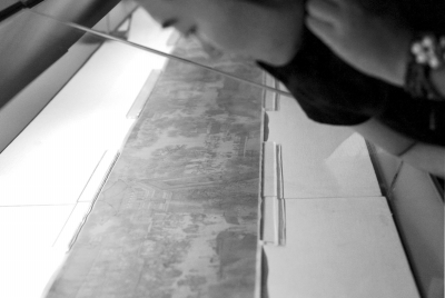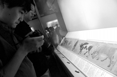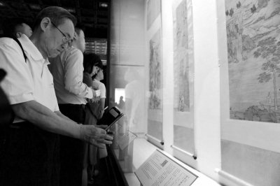 一名观众俯身细看《清明上河图》。京华时报记者王海欣摄