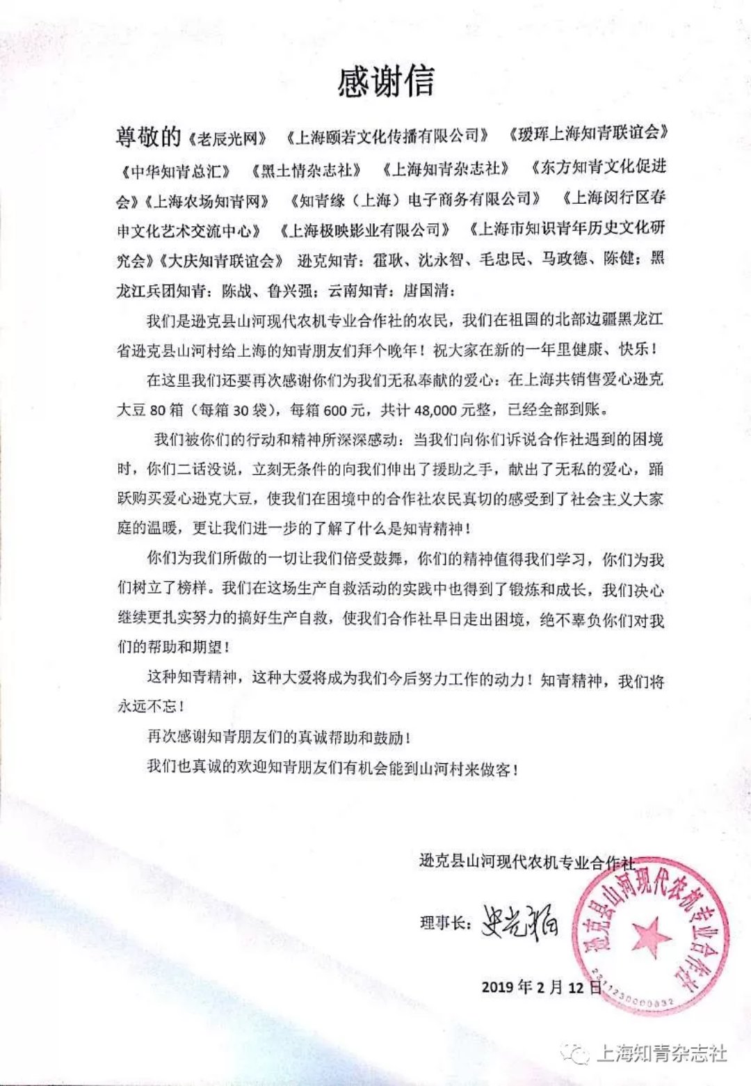 在这里我们还要再次感谢你们为我们无私奉献的爱心,在上海共销售爱心逊克大豆80箱(每箱30袋),每箱600元,共计48,000元整,已经全部到账。
