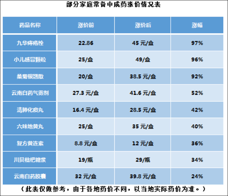 1月28日,《健康时报》发文表示,2018年,全国中成药涨价成常态。详情请见下表: