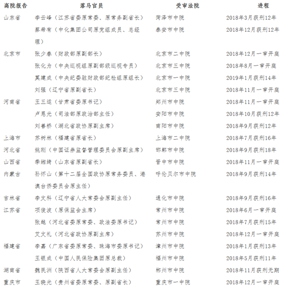 从今年各省高院的工作报告中,我们也能窥得在过去的一年,落马老虎最终在哪里过堂(不完全统计):