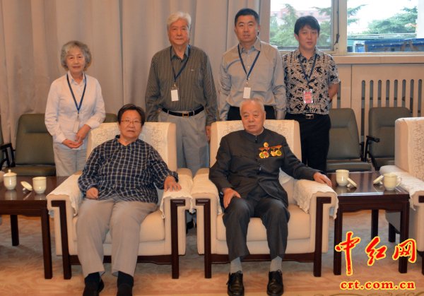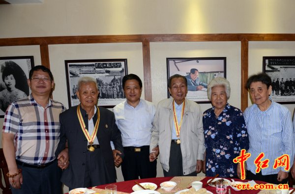 当年跟随毛主席转战陕北的电报员李锦华(左二)、新华社原副社长解力夫(左四)、毛主席纪念堂管理局原局长徐静(右二)、毛主席亲属孔淑静(右一)、融通汇信董事长李春平(左三)、融通汇信副总裁苏荣(左一)等合影留念。(中红网江山摄)