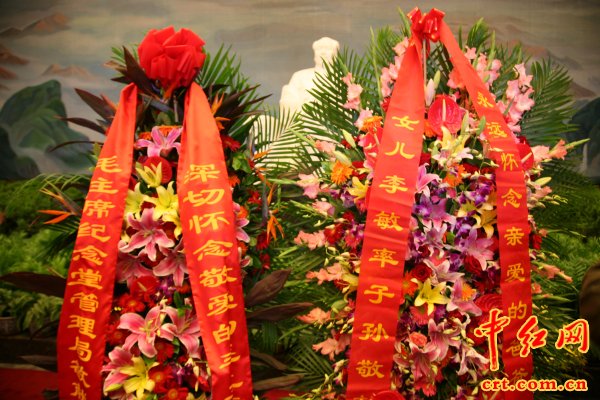 毛主席女儿李敏率子孙向毛主席纪念堂大厅的毛主席塑像敬献花篮。(中红网李学叶摄)