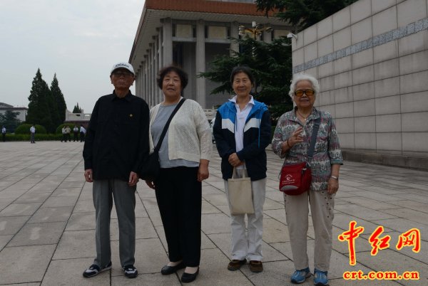“毛主席专列”工作人员在毛主席纪念堂合影留念。自左至右:刘学骞、胡秀琴、刘习琴、刘凤英。(中红网江山摄)