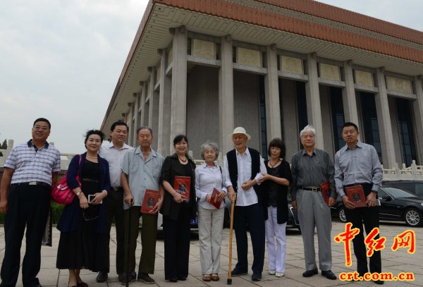 毛主席侄女毛小青(左五)和毛主席身边工作人员张玉凤(右五)、王笃恭(右四)、耿福东(左四)等在毛主席纪念堂合影留念。(中红网江山摄)