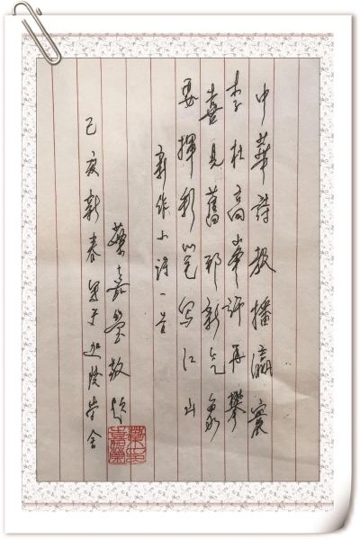 叶嘉莹先生抄录为“学习强国”新作小诗一首寄语:中华诗教播瀛寰,李杜高峰许再攀。喜见旧邦新气象,要挥彩笔写江山。