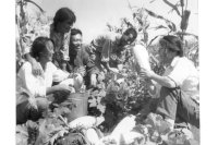 (图片说明:图中在知青食堂菜园子里收获蔬菜的人物都是插队在边疆公社山河大队的知青与下放干部。右一上海知青夏蓓蓓,右二上海外贸系统下放干部老张,右三上海外贸系统下放干部某,右四上海知青沈云秀,右五上海知青徐桔桔。)