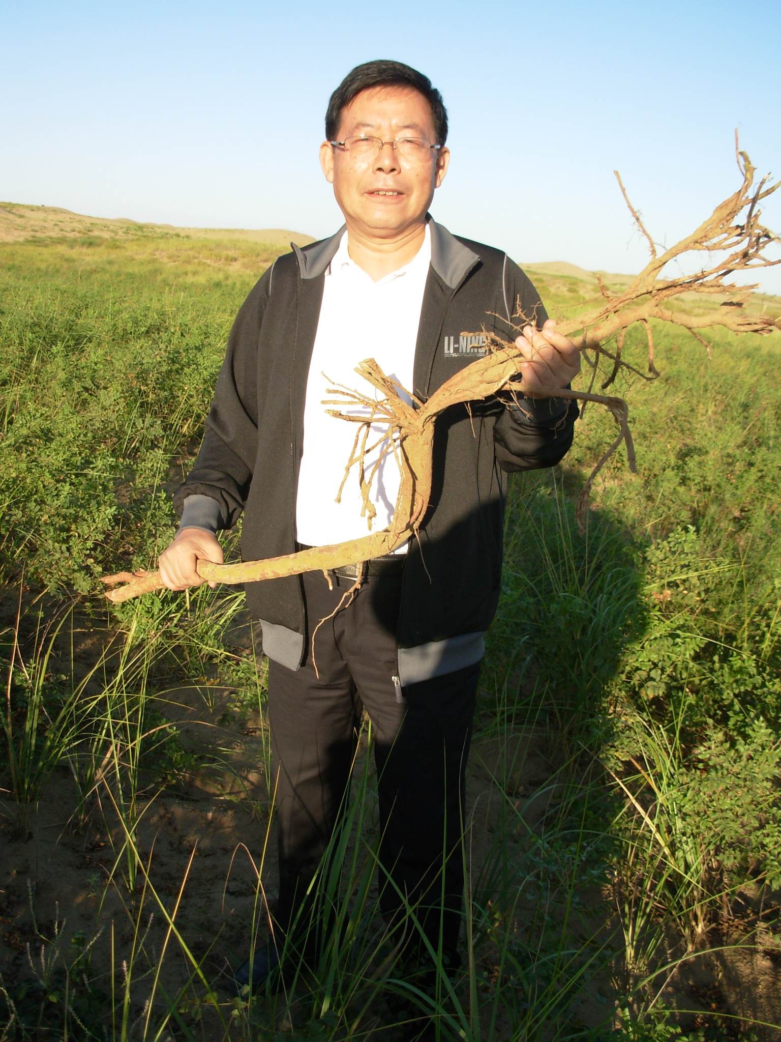 库布其大沙漠中,一片片莽莽苍苍、高高低低、葱葱郁郁的甘草林,犹如浩浩沙海中一片片绿洲。走进甘草地,甘草长势良好,大部分植株高可没膝,有些更可及腰。因今年雨水充足,地里的甘草几乎没有枯枝。试掘四、五株,掏出来的甘草根,长度都在一米以上,最大的两株,直径可达四、五公分,象两条擀面棍,王兴高兴地将之高高举起,让大家拍下这胜利的姿态和自豪的神情。(作者:原黑龙江兵团二师17团天津知青)