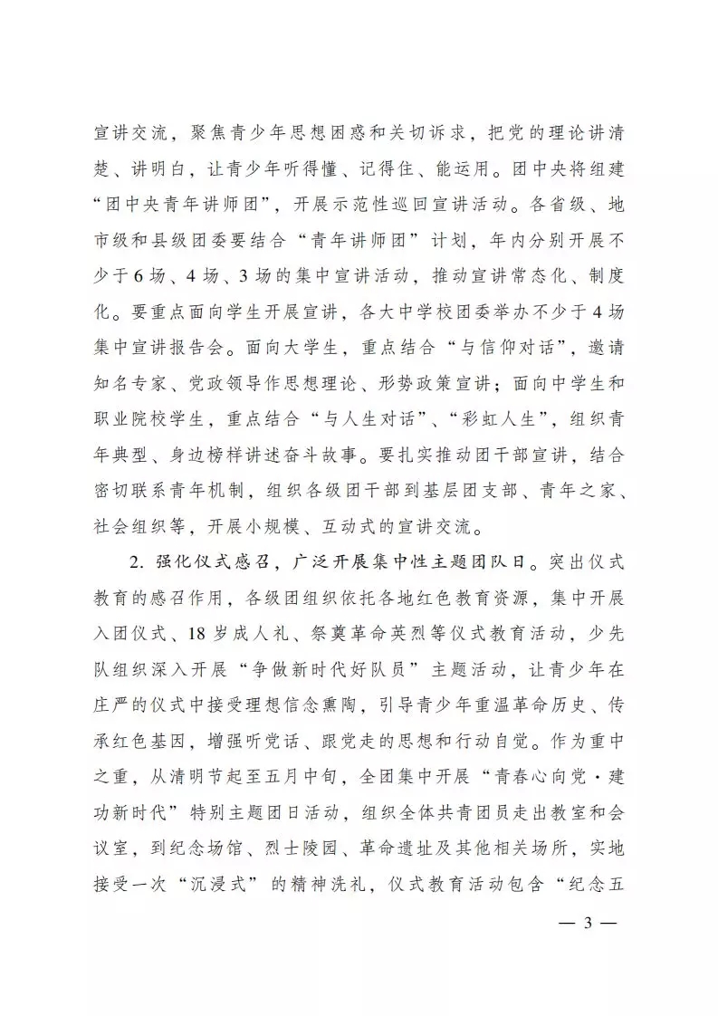 要广泛开展集中性主题团队日,突出仪式教育的感召作用,依托各地红色教育资源,集中开展入团仪式、18岁成人礼、祭奠革命英烈等仪式教育活动,组织全体共青团员实地接受一次“沉浸式”的精神洗礼。